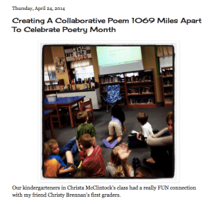 The piece of our reading about co-constructing the creative arts, particularly poetry, reminded me of one of the projects we worked on last year as part of Poetry month in April. A librarian friend, Shannon Miller, from Iowa and I were brainstorming ways to involve our younger students in the poetry fun. We decided to connect a group of my first grade students with Shannon’s kindergarteners through Google Hangouts. Shannon and I read a few poems for two voices from Messing Around on the Monkey Bars by Betsy Franco. The students loved listening to ‘Weird Stuff in the Lost & Found.’ Shannon & I thought that this would be a great poem for us to re-create with our students’ voices. We took turns typing their ideas into a Google Doc that both schools could see/edit at the same time. Each student had the opportunity to add a line to our poem. We all then read our finished poem together. Click HERE to read a copy! For more information, Shannon wrote a blog post about our connection. You’ll find it here: http://vanmeterlibraryvoice.blogspot.com/2014/04/creating-collaborative-poem-800-miles.html