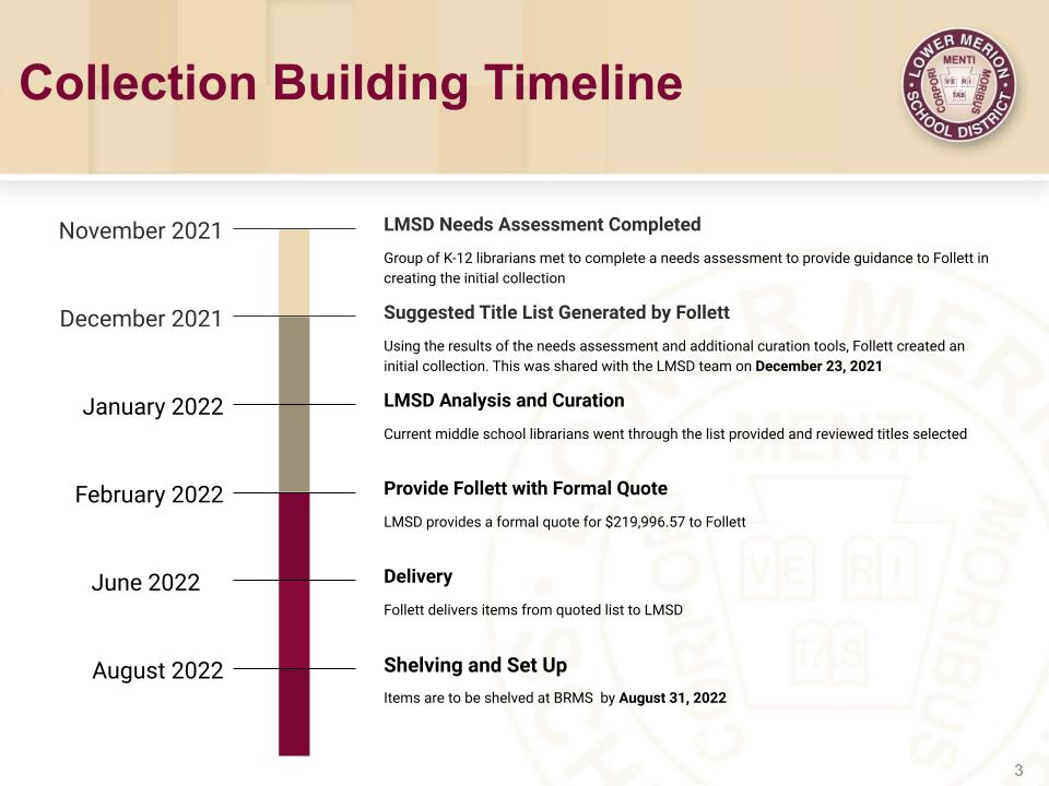 This slide deck was developed to explain the process and timeline behind the development of a new middle school library collection of approximately 13,000 titles and $220K to board members. I created all charts and graphics and provided additional editing of content prior to giving the presentation with colleagues.